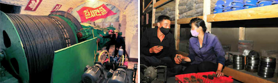 밝고 깨끗한 탈의실, 갖가지 공구들과 예비부속품들이 규모있게 놓여있어 마치 진렬장을 방불케 하는 공구함이며 예비부속품창고를 돌아보고 현장으로 들어서니 몇명의 로동자들이 용접봉을 만들기에 여념이 없었다.