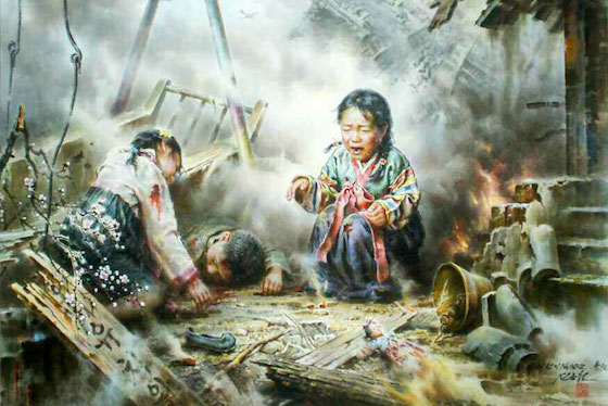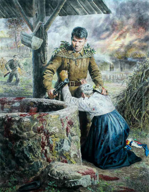 조선화 《피는 피로써》는 마을을 해방한 유격대원이 할머니로부터 피로 물든 우물에 대한 이야기를 전해들으며 복수를 다짐하는 모습을 생동하게 형상하고있다.