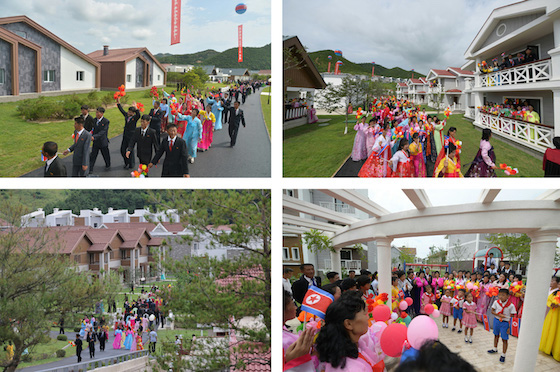 준공식장은 새 생활, 새 문명의 기쁨을 향유하는 락원군주민들의 크나큰 환희와 우리 식의 리상어촌건설로써 인민의 행복의 창조자로서의 명함을 빛내인 군인건설자들의 무한한 긍지로 끓어번지고있었다.