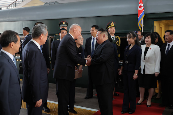 김정은동지께서는 전용렬차에서 내리시여 중국당과 정부의 지도간부들을 만나시고 반갑게 인사를 나누시였다.