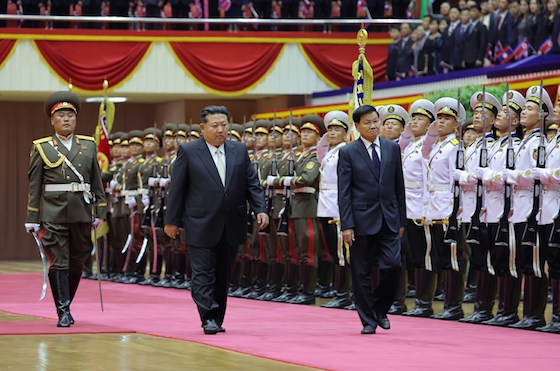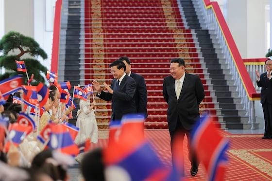 김정은동지께서는 라오스인민혁명당 중앙위원회 정치국 위원이며 정부부수상 겸 안전보위상인 위라이 라캄홍동지, 라오스인민민주주의공화국 외무상 통싸완 폼비한동지를 비롯한 라오스측 수행간부들과 인사를 나누시고 통룬 씨쑤릿동지와 함께 사열대에 오르시였다.