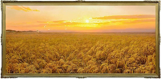 경애하는 총비서동지께서 작품이 정말 멋있다고, 벼바다 설레이는 풍요한 가을풍경이 바로 사회주의 우리 조국의 참모습이라고 그리도 높이 평가하신 대형유화작품 《풍요한 가을》,
