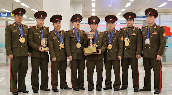 제1차 국제군사체육리사회 군대남자력기경기대회에 참가하였던 우리 선수들 귀국