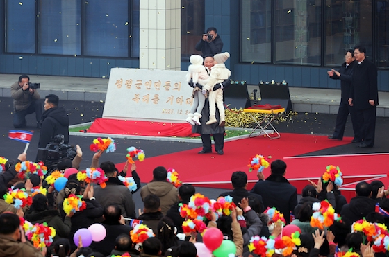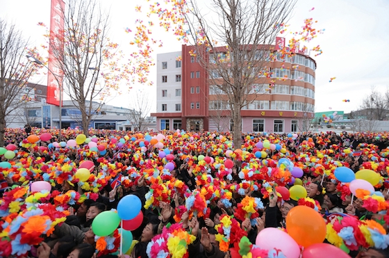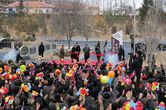 김정은동지께서 준공식장에 도착하시자 인민의 위대하신 령도자를 우러러 터치는 격정의 환호성이 하늘땅을 진감하며 울려퍼지였다.