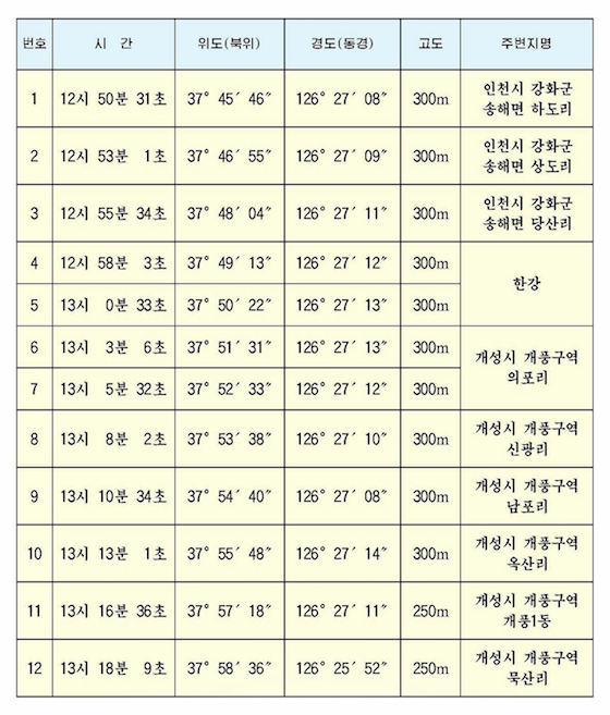 2025년 9월 27일에 추락된 적무인기의 비행경로