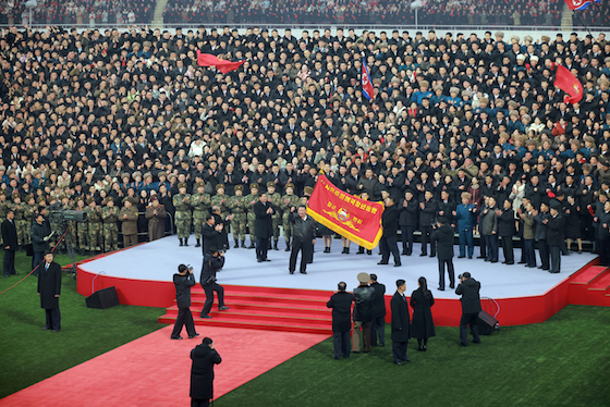 김정은동지께서는 사회주의애국청년동맹기발에 김정일훈장을 달아주시고 청년동맹중앙위원회 위원장에게 훈장증서를 전달하시였다.