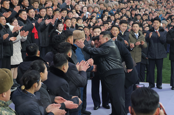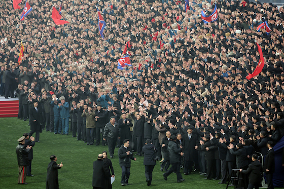 김정은동지께서는 열광의 환호에 따뜻이 답례하시며 청춘의 아름다운 희망과 포부를 조국의 번영을 위함에 깡그리 바치며 값높은 위훈의 자욱을 새겨가고있는 온 나라 청년들에게 축하의 인사를 보내시였다.