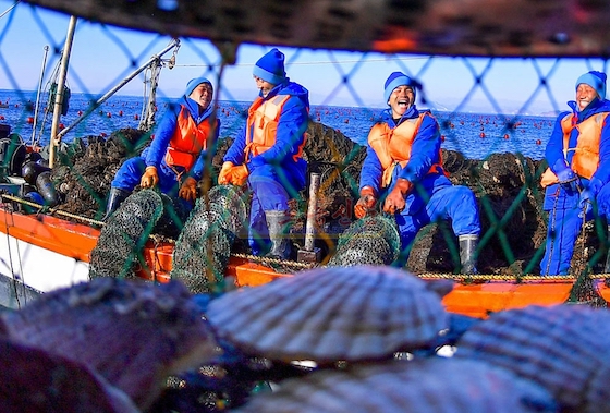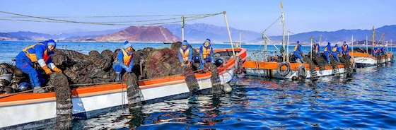 동행한 몇몇 일군들이 경애하는 총비서동지께 양식하고있는 밥조개를 보여드리기 위해 바다물속에 잠겨져있는 드레를 들어올리였다.