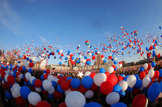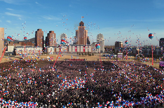 순간 열광의 환호성과 함께 축포가 터져오르고 오각별이 빛나는 고무풍선들이 무수히 날아올랐다.
