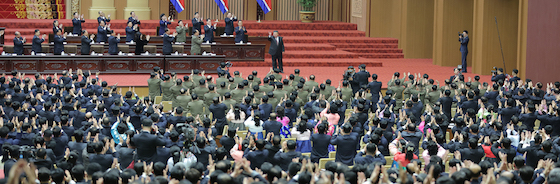 김정은동지께서 회의장에 나오시자 전체 참가자들은 위대한 사상과 걸출한 정치실력으로 우리 국가의 절대적존엄과 국력을 세기의 절정에 올려세우시고 인민의 리상과 무궁한 행복이 전면적으로 실현되는 거창한 번영의 새시대를 펼쳐주신 희세의 천출위인, 인민의 령도자를 열광적인 박수로 맞이하였다.