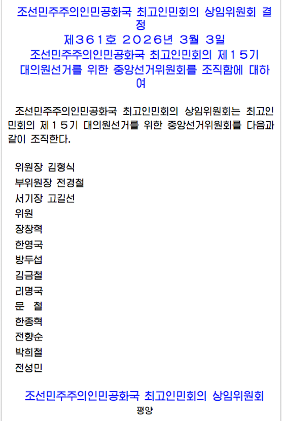 - 조선민주주의인민공화국 최고인민회의 상임위원회 결정 조선민주주의인민공화국 최고인민회의 제15기 대의원선거를 위한 중앙선거위원회를 조직함에 대하여