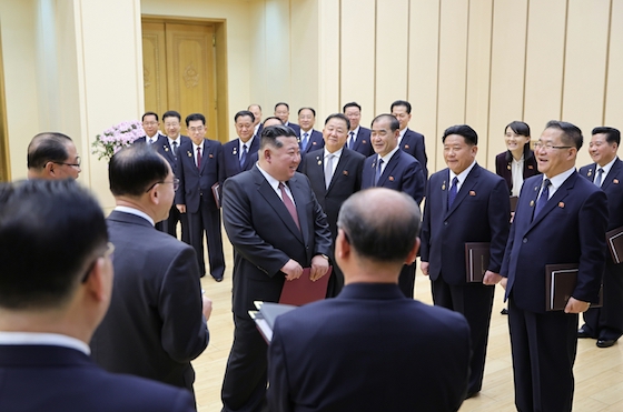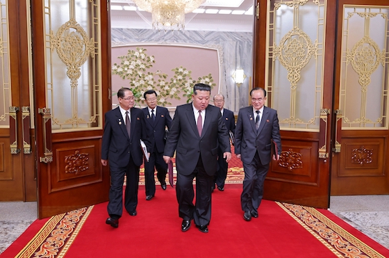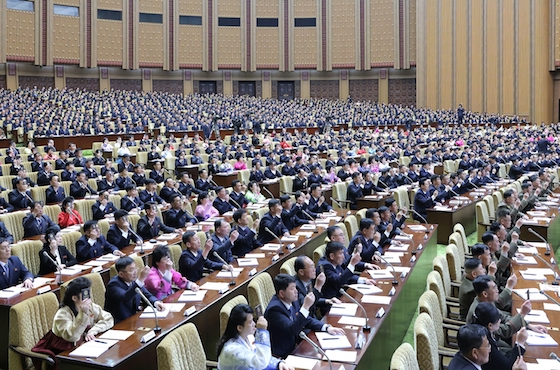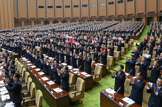 김정은동지께서 회의장에 나오시자 전체 참가자들은 위대한 사상과 걸출한 정치실력으로 우리 국가의 절대적존엄과 국력을 세기의 절정에 올려세우시고 인민의 리상과 무궁한 행복이 전면적으로 실현되는 거창한 번영의 새시대를 펼쳐주신 희세의 천출위인, 인민의 령도자를 열광적인 박수로 맞이하였다.