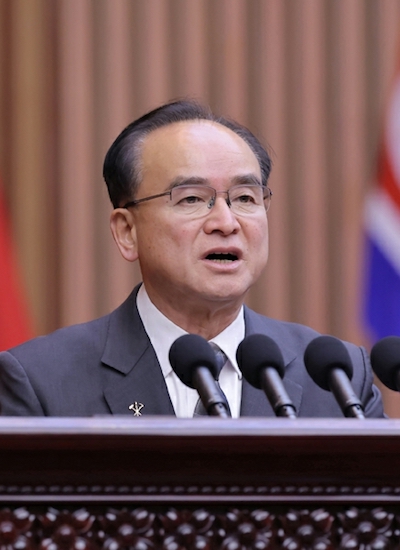 그는 김정은동지의 국가건설사상과 령도에 일심충성하는 길에 우리 조국의 무궁한 번영과 강대함이 있고 온 나라 인민의 복리증진이 있다는것이 상임위원장으로 사업하면서 체득한 절대의 진리이라고 강조하였다.