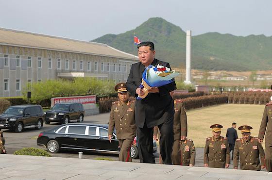 김정은동지께 전군장병들의 한결같은 흠모의 마음을 담아 군관들이 향기그윽한 꽃다발을 삼가 드리였다.