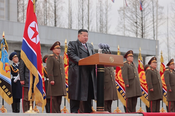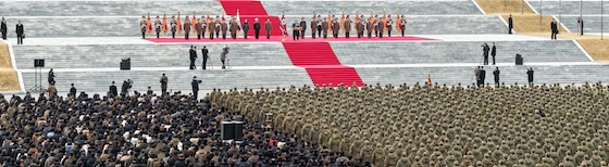 김정은동지께서는 조국앞에 언제나 충실한 관병들의 헌신적복무에 감사와 숭고한 경의를 드린다고 하시면서 연설을 마치시였다.