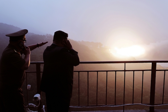조선로동당 총비서이시며 조선민주주의인민공화국 국무위원장이신 경애하는 김정은동지께서 해당 시험을 참관하시였다.