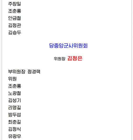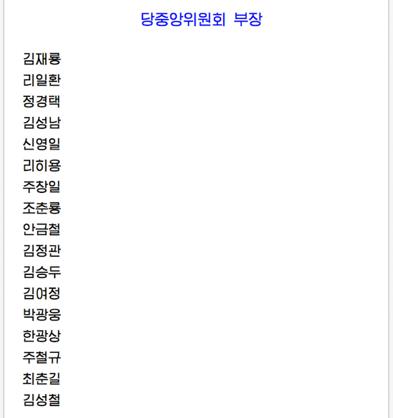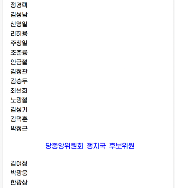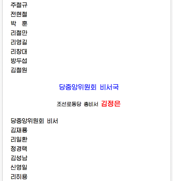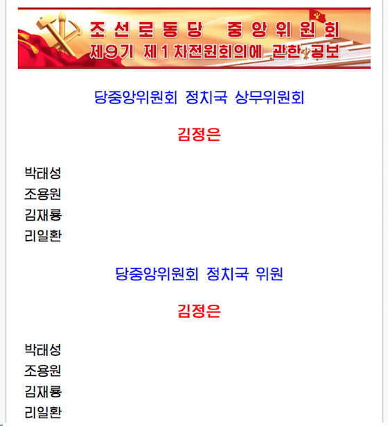 전체 대표자들의 한결같은 의사에 따라 우리 당과 국가, 인민의 최고대표자이신 김정은동지를 위시하여 당중앙위원회 정치국 성원들을 포함한 39명으로 집행부가 구성되였다.