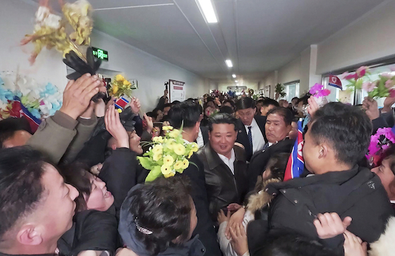 김정은동지께서는 착공식에 참가한 해외군사작전참전군인들과 상봉하시고 사랑의 한품에 따뜻이 안아주시며 건강을 회복한 그들을 힘있게 격려해주시였다.